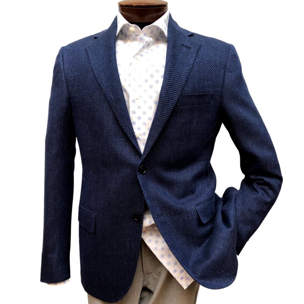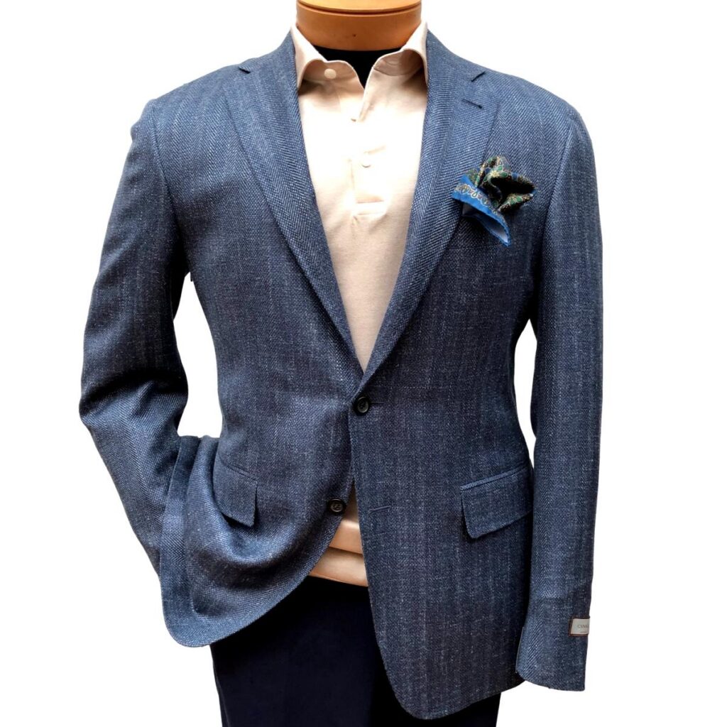 A lighter blue color with this herringbone weave makes this ensemble a winner for business or casual wear.